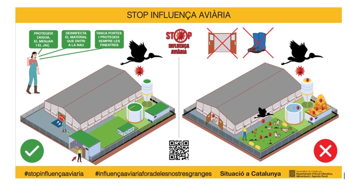 Podeu consultar totes les mesures de bioseguretat al web del Departament d’Acció Climàtica, Alimentació i Agenda Rural (Influença aviària d'alta patogenicitat en aus de corral. Departament d'Agricultura, Ramaderia, Pesca i Alimentació )