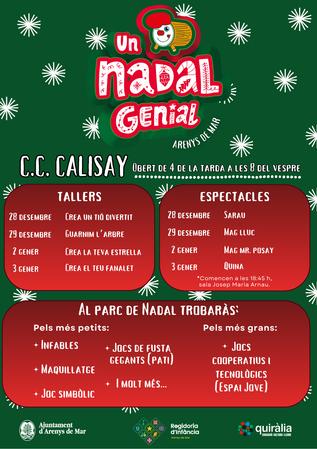 Arenys viurà aquestes festes un “Nadal Genial”, una proposta pensada especialment per a infants i famílies que tindrà lloc al Centre Cultural Calisay i al seu entorn. Obrirà aquest diumenge 28 de desembre fins al 3 de gener, cada tarda de 16 a 20 h, amb una programació variada de tallers, espectacles i espais de joc.