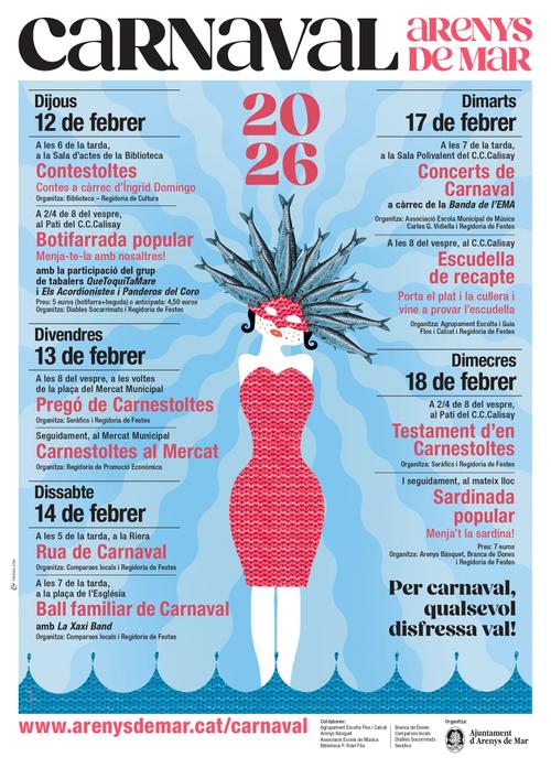 Arenys es prepara per viure una nova edició del Carnaval amb una setmana plena d’activitats culturals, festives i populars que s’allargaran del 12 al 18 de febrer. El programa inclou propostes per a totes les edats, amb actes repartits per diversos espais de la vila i amb la participació d’entitats locals. El programa està organitzat per l’Ajuntament i diverses entitats del municipi.