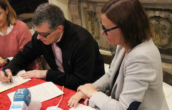 L'alcaldessa Annabel Moreno i el rector de la parròquia d'Arenys de Mar, mossèn Elies Ferrer, han signat aquest matí un conveni de col·laboració per facilitar la visita al retaule barroc de l´església de Santa Maria.