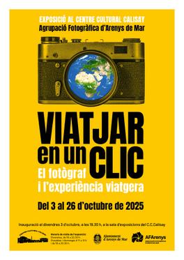 La Sala d'Exposicions del Calisay acull a partir del divendres 3 d'octubre, a les 19.30 h, la mostra que organitza l’Agrupació Fotogràfica d’Arenys de Mar (AFA) “Viatjar en un clic. El fotògraf i l'experiència viatgera”. L’exposició es podrà visitar fins al 26 d’octubre i recull obres que exploren el viatge com a motor creatiu i vital en el món de la fotografia.