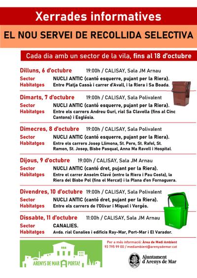 L’Ajuntament d’Arenys de Mar continua amb el cicle de sessions informatives sobre el nou servei de recollida selectiva porta a porta. Un total de 750 persones han participat fins ara a les 10 xerrades que s’han fet dedicades, sobretot, a la part alta de la Riera.
