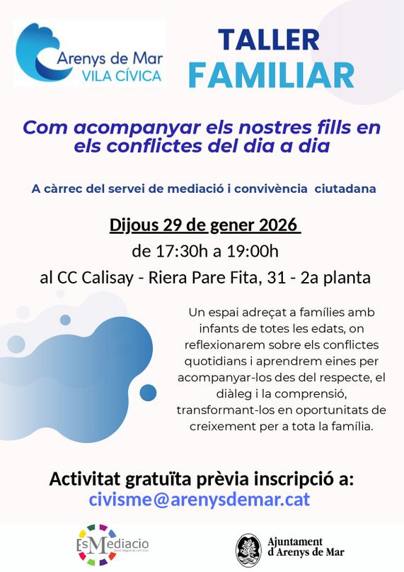 El proper dijous 29 de gener de 2026, el Calisay acollirà un taller familiar adreçat a famílies amb infants de totes les edats, amb l’objectiu de reflexionar sobre els conflictes del dia a dia i aprendre eines per acompanyar-los des del respecte, el diàleg i la comprensió.